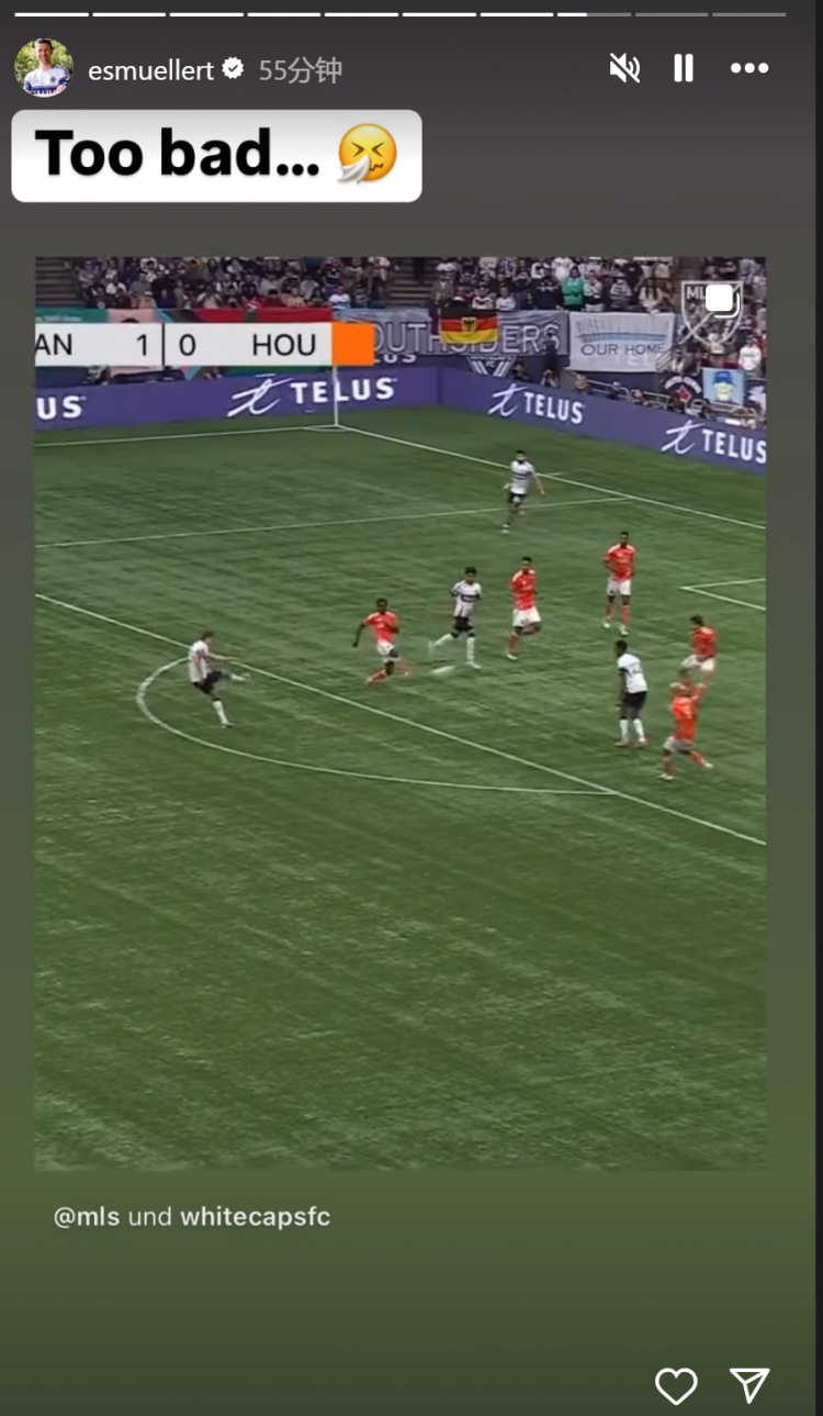 8月18日讯 在今天进行的美职联比赛中,温哥华白浪主场1-1休斯顿迪纳摩。穆勒此役替补出场上演温哥华白浪首秀,他在禁区弧顶处远射破门,但因队友越位在先,进球被取消。穆勒社媒晒出进球的视频,配文:“太可惜了。”...